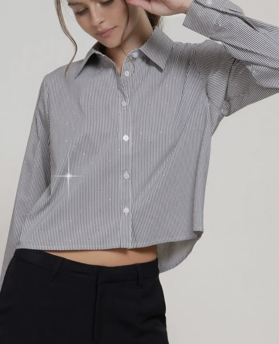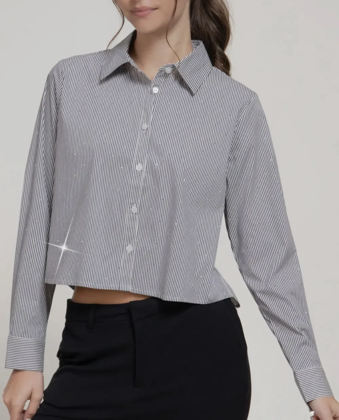 Shop › Sparkle button down Image 1 of 4 Image 2 of 4 Image 3 of 4 Image 4 of 4 Sparkle button down $38.00 Black and white stripeRhinestone detailButton down shirt Size: Small Medium Large Quantity: Add To Cart Added! Black and white stripeRhinestone detailButton down shirt